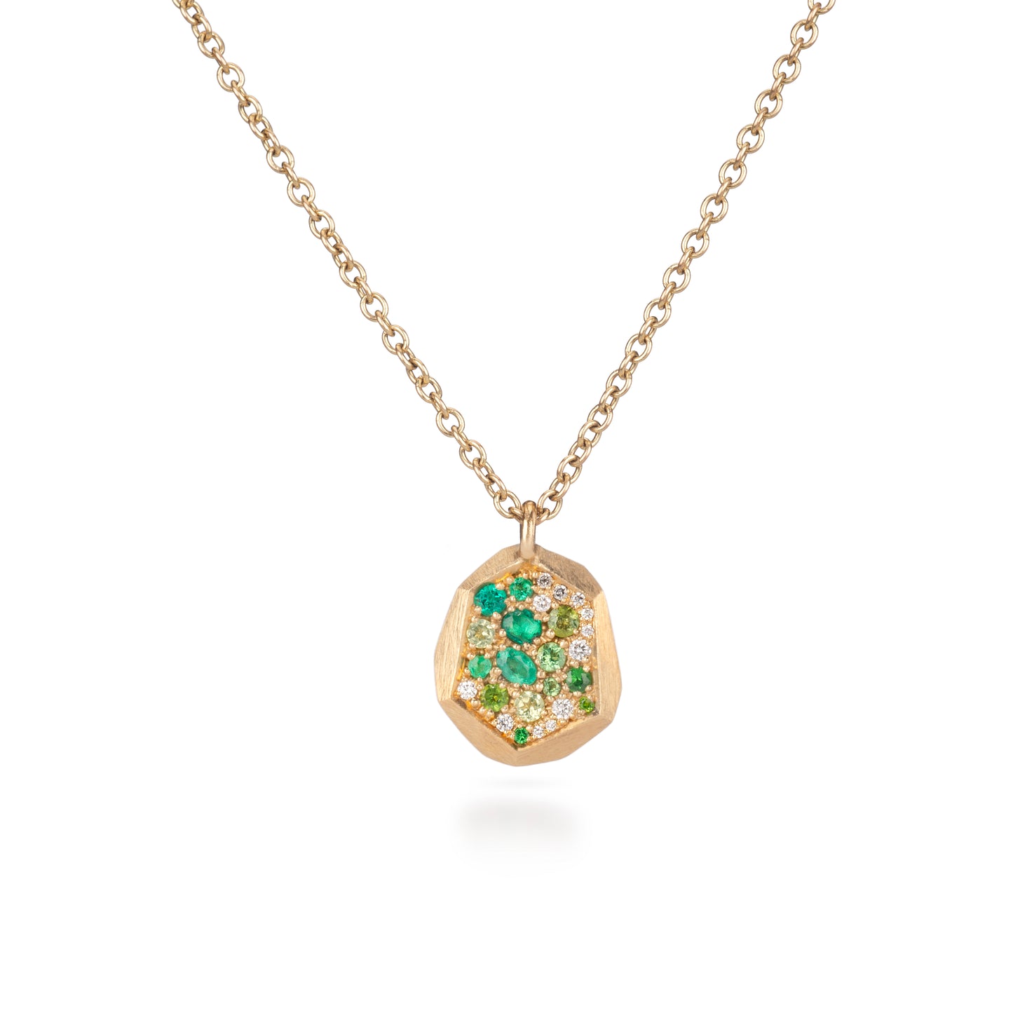 A sculptural celebration of colour and texture. This pendant is handcrafted in 9ct yellow gold, featuring crisp faceted edges and a richly textured satin finish. At its heart lies a vibrant pavé of mixed gemstones — emerald, peridot, green tourmaline, chrome diopside, and salt and pepper diamonds — set in a lively constellation of shapes and tones.