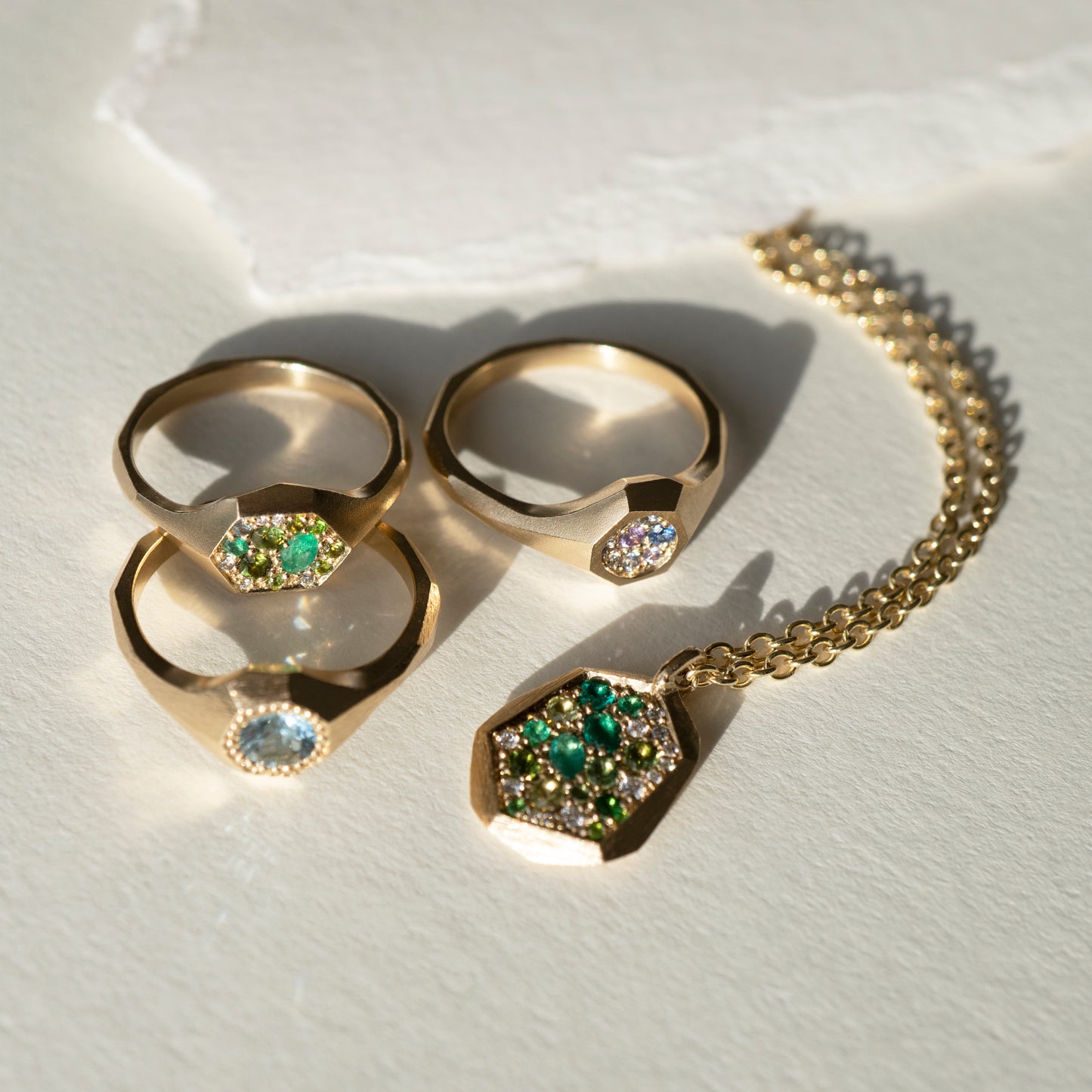 Recycled post-consumer 9ct yellow gold, emerald, peridot, green tourmaline, chrome diopside, and salt & pepper diamonds.
